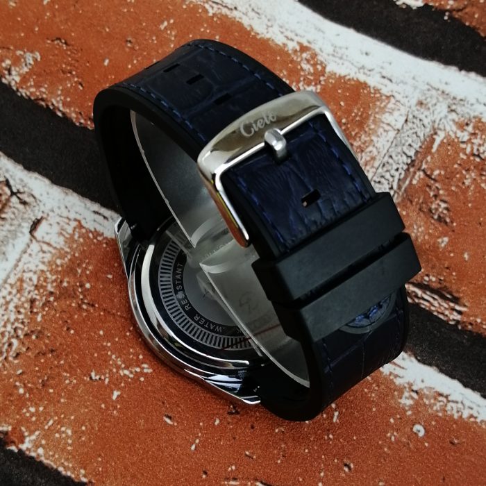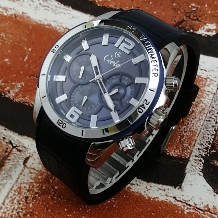 ساعت مچی مردانه Cielo در این محصول با بند طرح دار سرمه ای عرضه شده است. که قاب نقره ای رنگ براق زیبایی آن را چند برابر کرده است.این ساعت با ظاهر ساعت چند موتوره است که یکی از نمایشگر های داخلی نمایشگر روز هفته ودیگری نمایشگر تاریخ ماه میباشد. اعداد ۶ و ۱۲ با ظاهر درشت باعث شده اند که این ساعت به زیبایی از دور به چشم بیاید.